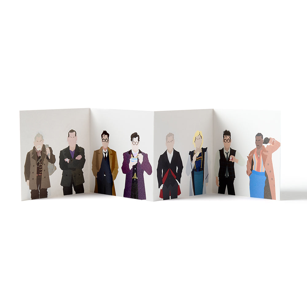 The first side of the concertina features Doctors one to eight, and the opposite side shows the War Doctor to the Fifteenth Doctor.